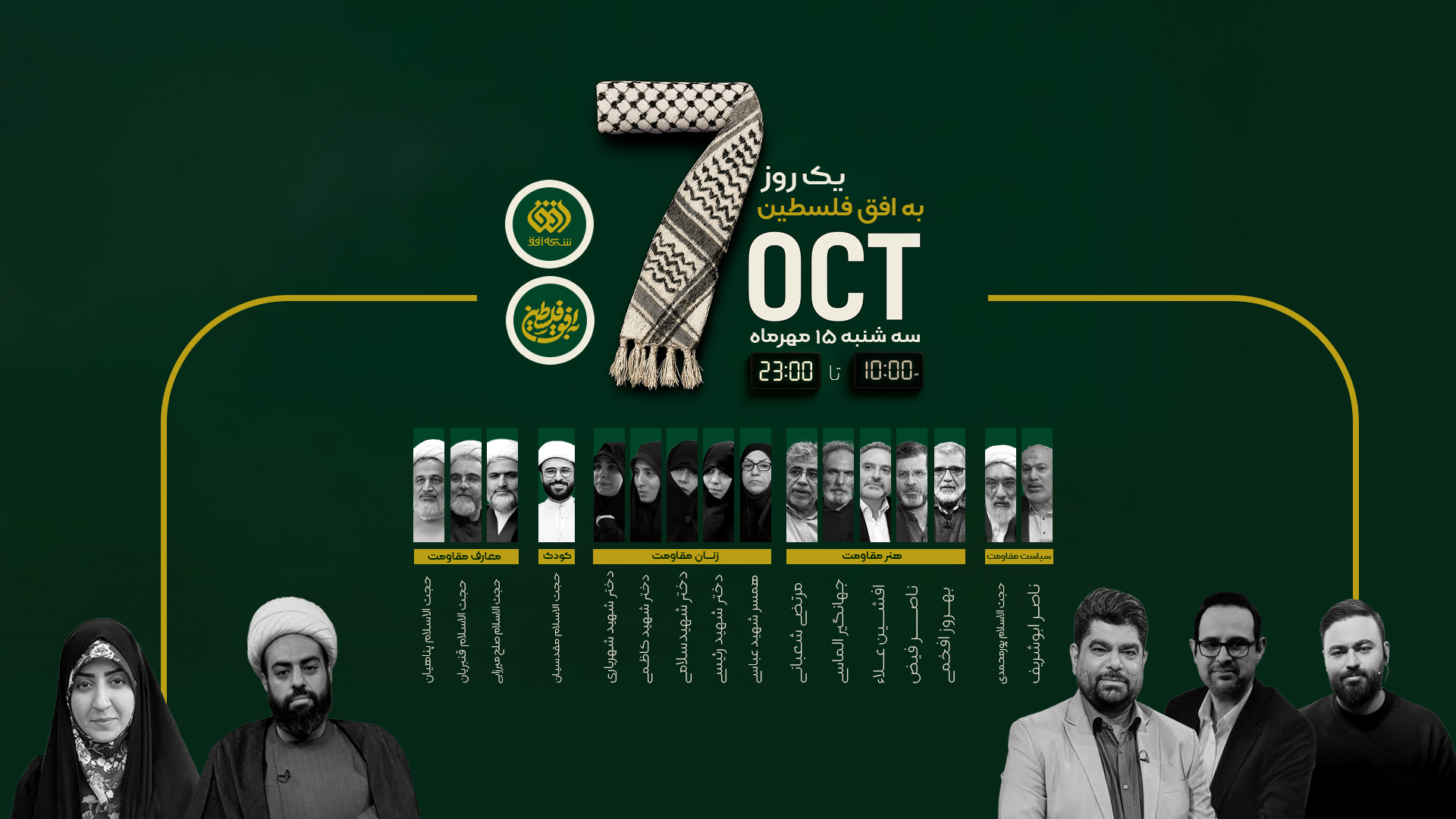 ویژهبرنامهی زندهی «به افق فلسطین» سهشنبه، ۱۵ مهرماه از ساعت ۱۰ صبح تا ۲۳ از شبکه افق پخش میشود؛ این برنامه با محوریت غزه و طوفان الاقصی است و با حضور کارشناسان مذهبی، خانواده معظم شهدا، هنرمندان و چهرههای سیاسی، به موضوع فلسطین و مقاومت خواهند پرداخت.