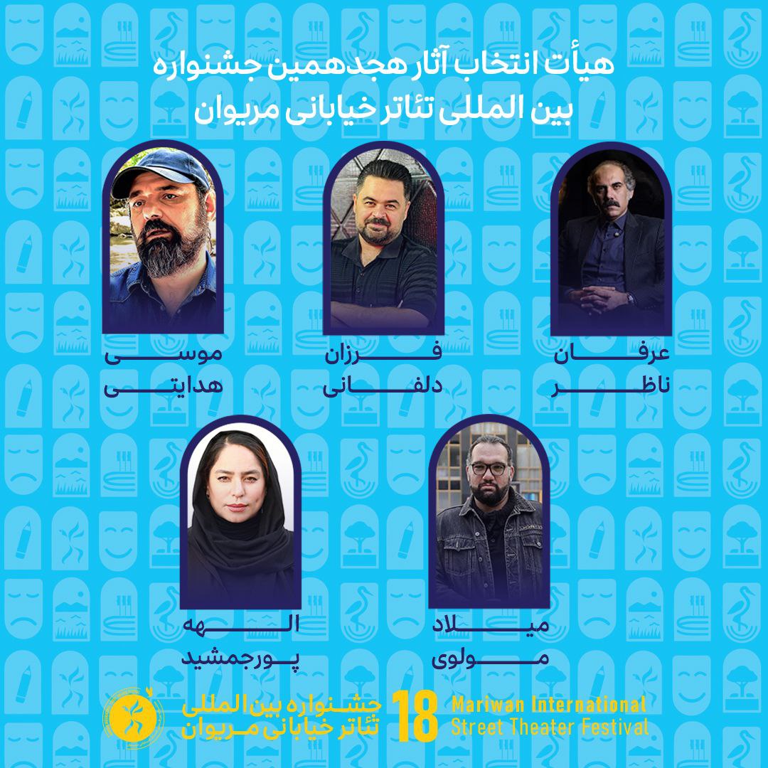 به گزارش سینماخانه و به نقل از روابط عمومی جشنواره، هیات انتخاب آثار هجدهمین جشنواره بینالمللی تئاتر خیابانی مریوان متشکل از الههپور جمشید، عرفان ناظر، فرزان دلفانی، موسی هدایتی و میلاد مولوی پس از بررسی آثار رسیده، فهرست نهایی آثار پذیرفتهشده در چهار بخش «مسابقه آزاد»، «آیینی سنتی»، «دگرگونههای اجرایی» و «کودک و نوجوان» معرفی کردند.