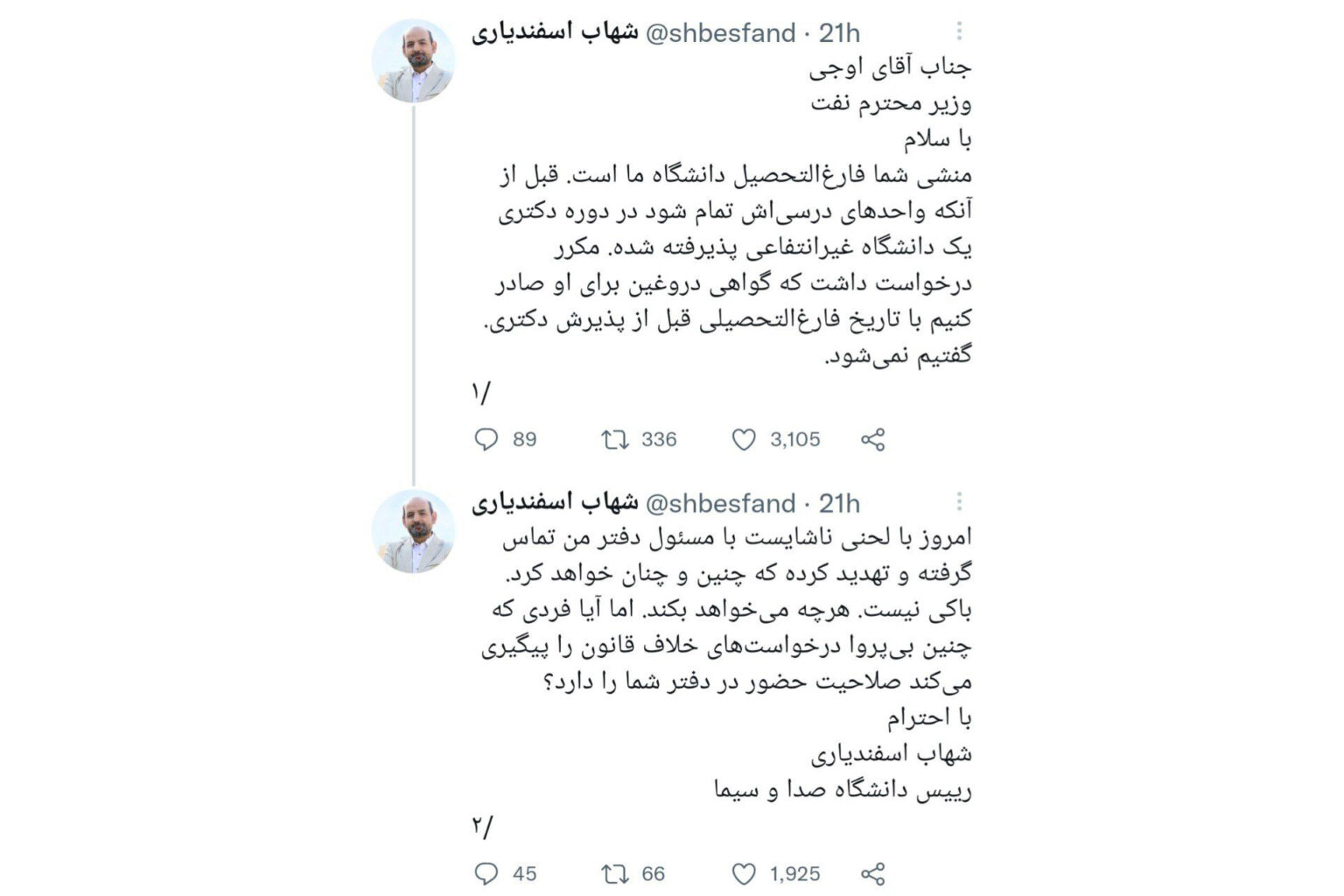 شهاب اسفندیاری رییس دانشکده صداوسیما با انتشار مطلبی در فضای مجازی از درخواست غیرقانونی منشی وزیر نفت از دانشکده صدا و سیما پرده برداشت.